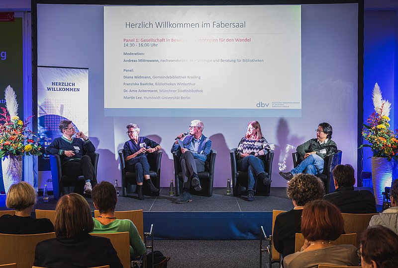 Am Nachmittag standen den Teilnehmenden je nach Interesse zwei Panels zur Auswahl: Im Fabersaal wurde das Thema „Gesellschaft in Bewegung – Strategien für den Wandel“ diskutiert und von Andreas Mittrowann moderiert. Auf der Bühne berichteten Diana Widmann, Gemeindebibliothek Krailling, Franziska Baetcke, Bibliotheken Winterthur, Dr. Arne Ackermann, Münchner Stadtbibliothek und Martin Lee, UB der Humboldt Universität Berlin von ihren Strategieprozessen, die sie durchgeführt hatten.