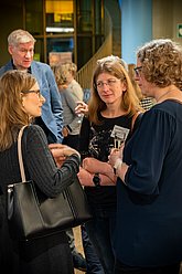 Das dritte Panel behandelte das Thema „Demokratie – Grenzen des Dritten Ortes“ und wurde von Tanja Fottner, Leiterin der Stadtbücherei Augsburg moderiert. Nicht zuletzt das Vorgehen der Stadtbücherei Münster, von dem Cordula Gladrow berichtete, führte zu engagierten Diskussionen, an denen sich auf der Bühne auch Marit Kunis, Städt. Bibliotheken Dresden, Milena Pfafferott, Universitätsbibliothek Ilmenau und Frauke Papencort, Stadtbüchereien Düsseldorf, beteiligten.