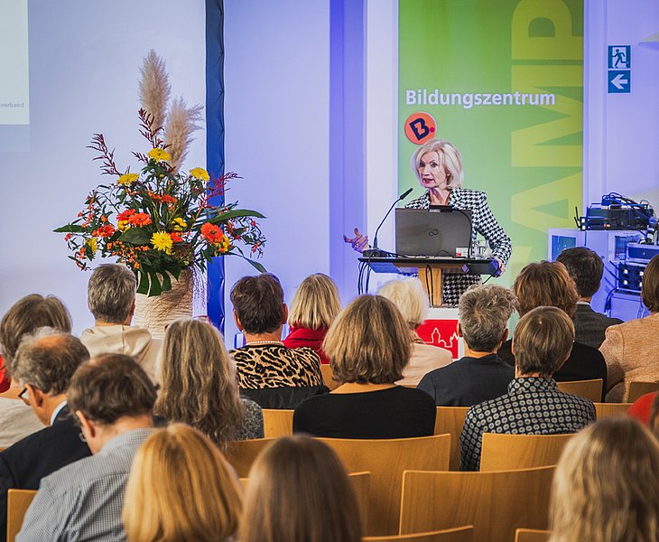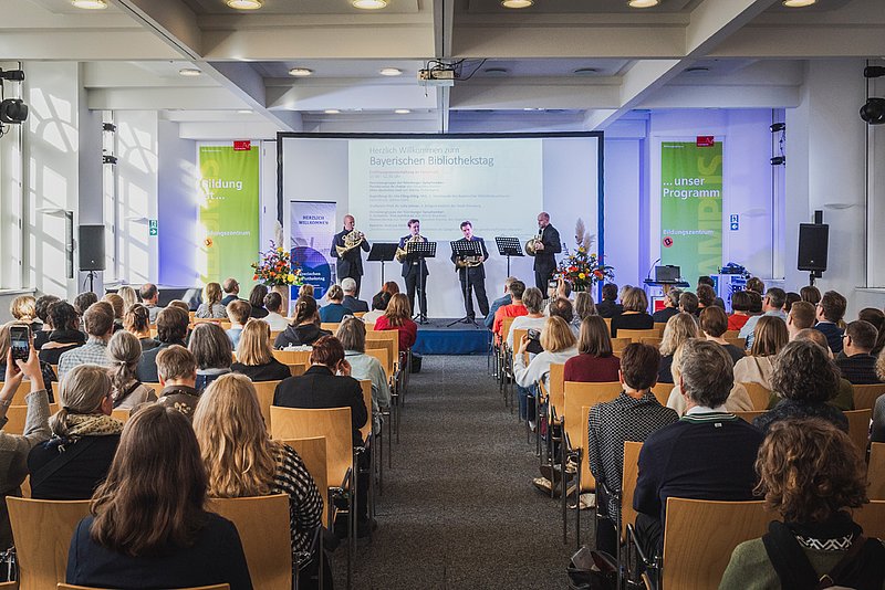 In Vertretung der ersten Vorsitzenden des BBV Frau Dr. Ute Eiling-Hütig (MdL), die leider krankheitsbedingt verhindert war, eröffnete Frau Sabine Guhl, Geschäftsführerin des BBV und Kulturamtschefin der Stand Weiden, die Veranstaltung und begrüßte die 160 Gäste aus allen bayerischen Regionen. Ihr folgte mit einem Grußwort für die Stadt Nürnberg deren 2. Bürgermeisterin Prof. Dr. Julia Lehner, die sich schon von jeher nachdrücklich und erfolgreich für die Unterstützung der Bibliotheken einsetzt. Anschließend referierte Andreas Mittrowann (nachvorndenken.de) zum Thema „Tradition und Transformation: Bibliotheken als Spiegel und Motor des gesellschaftlichen Wandels“ und bezog das Publikum in seine Überlegungen mit ein. Für die musikalische Umrahmung sorgte die Hornistengruppe der Nürnberger Symphoniker, die nicht nur musikalisch glänzten, sondern auch besonderes Gespür für ihre Musikauswahl bewiesen.